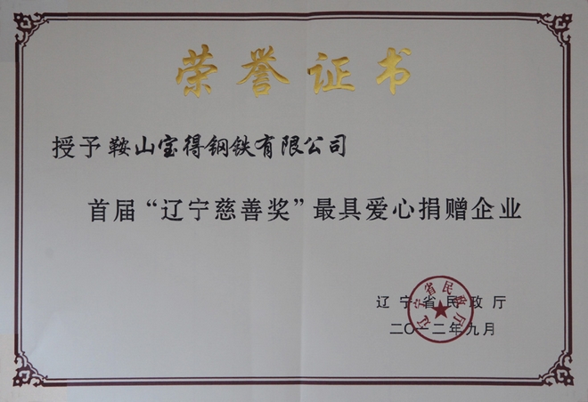 2012年9月,公司榮獲首屆“遼寧慈善獎(jiǎng)”最具愛心捐贈(zèng)企業(yè)。